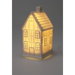 Dekorativní porcelánový domeček s LED osvětlením. V domečku je 1x LED dioda teplá bílá. Napájení 2x LR44 (baterie součástí výrobku).