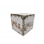 Zdobeno motivem pohádkové vánoční vesnice s domečky, stromečky, postavičkami a vločkami v horní části. Kombinace jemných barev s bílým porcelánem vytváří harmonickou a vánoční kompozici.