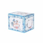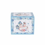 Zdobeno motivem pohádkovou rodinou sněhuláků s modrým domem v pozadí a hvězdičkami. Kombinace jemných barev s bílým porcelánem vytváří harmonickou a vánoční kompozici.