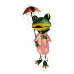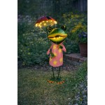 Veselá kovová žába v růžových šatech s květinovým vzorem drží barevný deštník, který jí dodává jedinečný šarm. Skvělá dekorace do zahrady, na balkon nebo terasu, která přinese úsměv na tvář za každého počasí.