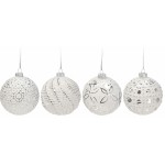 Skleněné baňky - bílé se stříbrnou patinou. Balení = 12 ks baněk mix druhů v prodejní krabici. Materiál: sklo Rozměr: průměr 8 cm